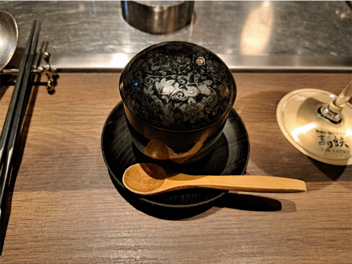 黒唐草模様の茶碗蒸しの器。牛骨スープの透明感も伝わるでしょうか。