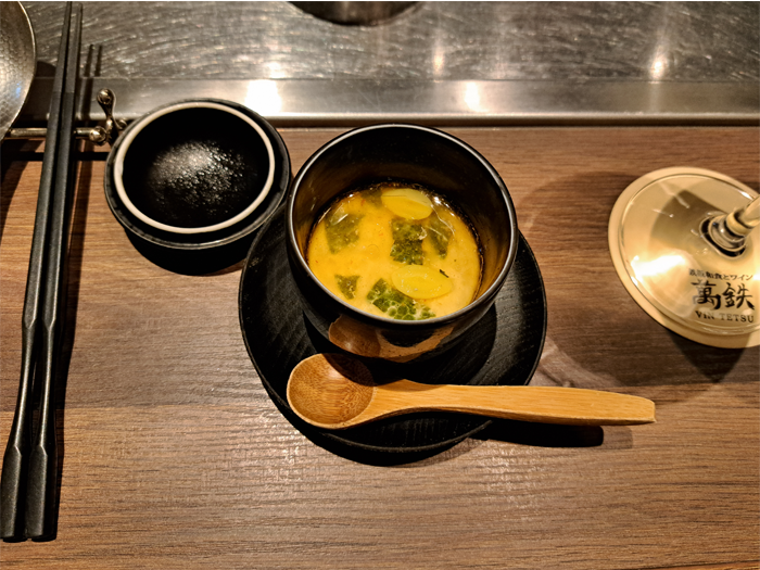 スープは、合鴨と焼き葱のスープ 鉄板仕立て。