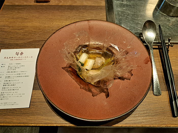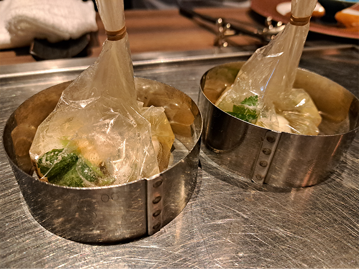 CARTA FATAフィルムで包んだ、合鴨と焼き葱のスープを目の前の鉄板で温めます。