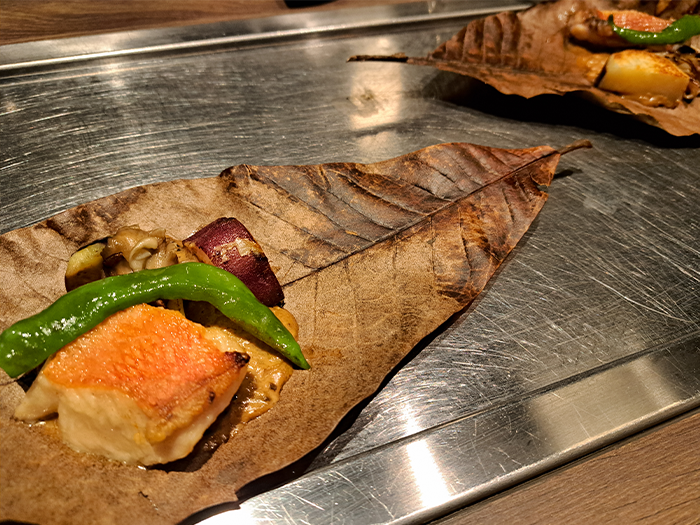 海鮮の品は、金目鯛ムニエルと秋野菜の朴葉焼きデュクセルソース。