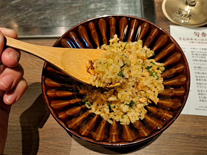 私たちは、秋鮭のガーリックライスを選びました。